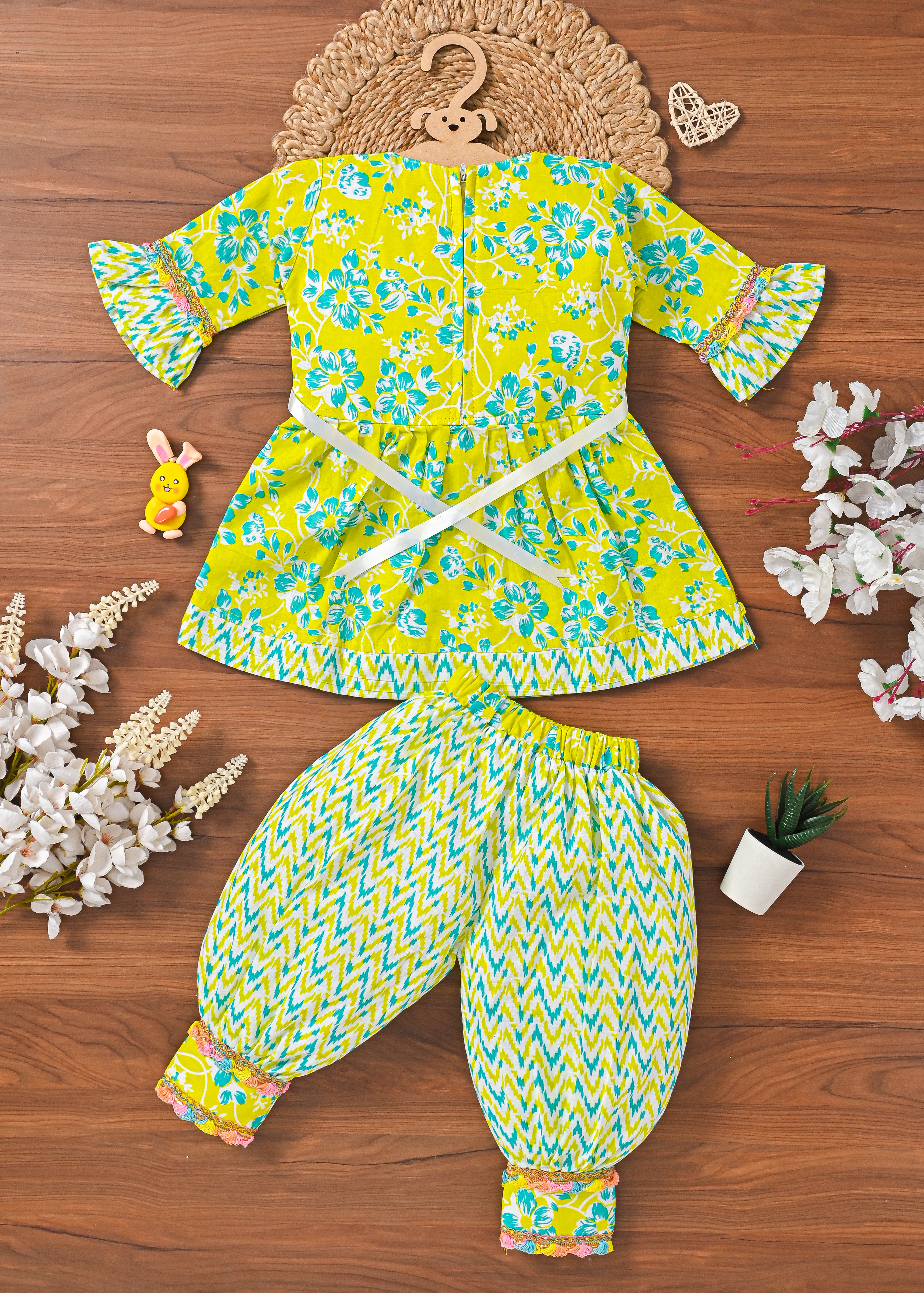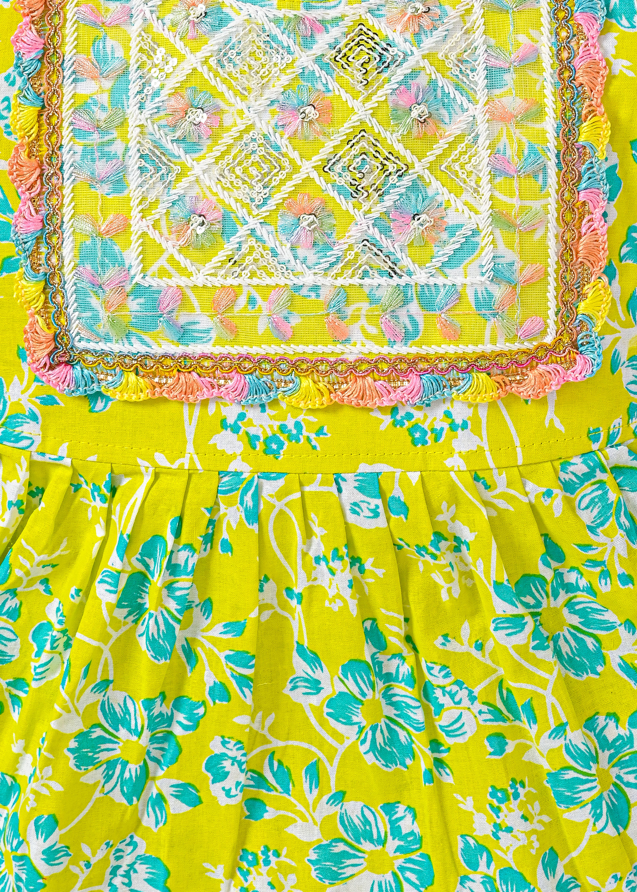 Brighten up your little one’s wardrobe with this vibrant yellow ethnic set. The outfit includes a beautifully printed kurta top with intricate embroidery and playful bell sleeves, paired with matching chevron-patterned dhoti pants. Designed for comfort and style, this dress is perfect for festive occasions, family gatherings, or casual outings. The soft cotton fabric ensures all-day comfort, while the cheerful prints add a touch of charm to your child’s look.