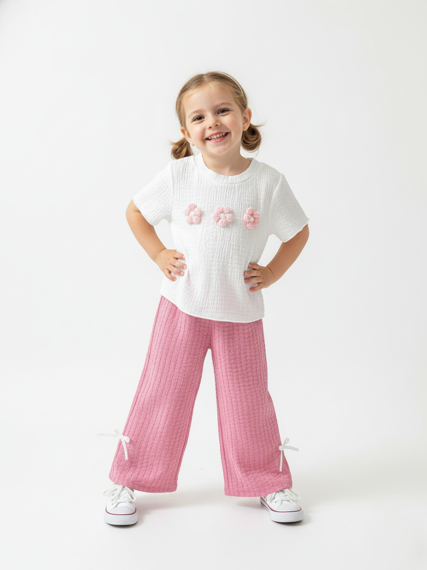 Discover this adorable girls’ two-piece outfit featuring a soft white top with 3D flower appliqués and cozy pink ribbed pants with side bows. Perfect for everyday wear, photoshoots, and special outings. Made from soft, breathable fabric to keep your little one stylish and comfortable all day long.