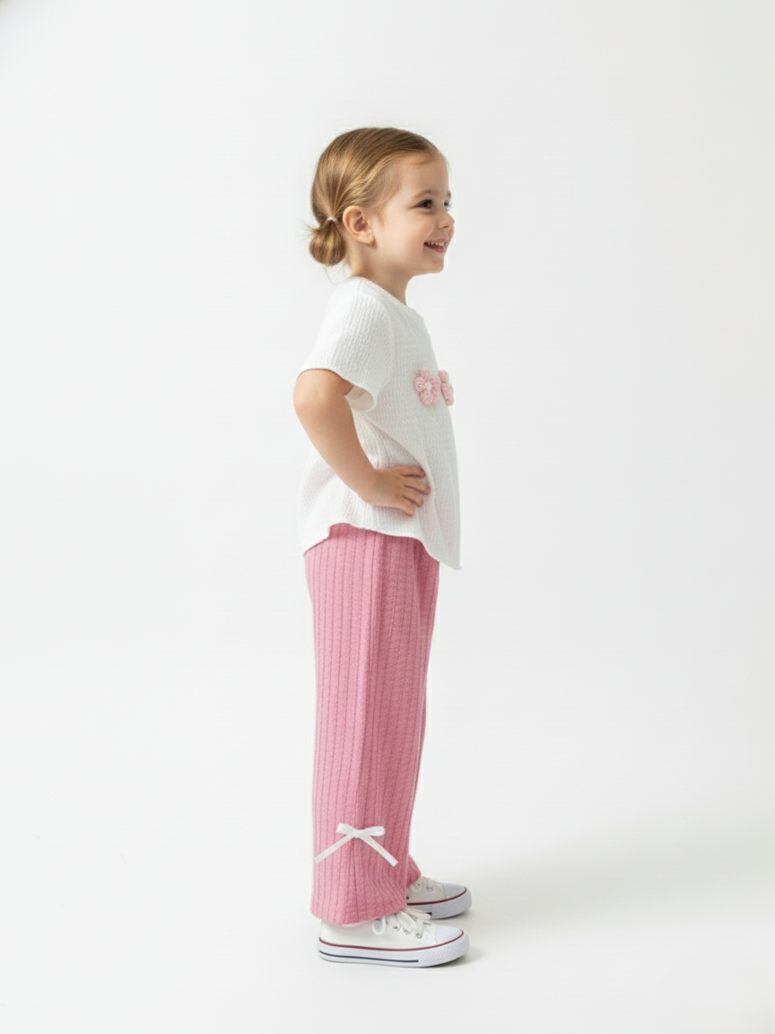 • Comfort Fit: Pink wide-leg ribbed pants with bow details for style and ease.