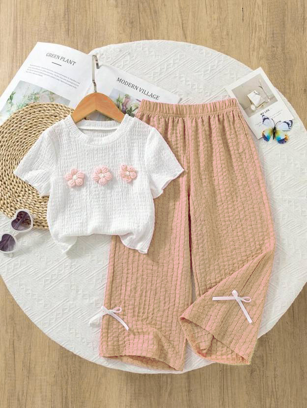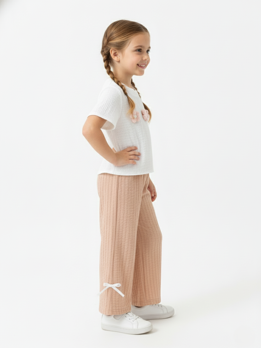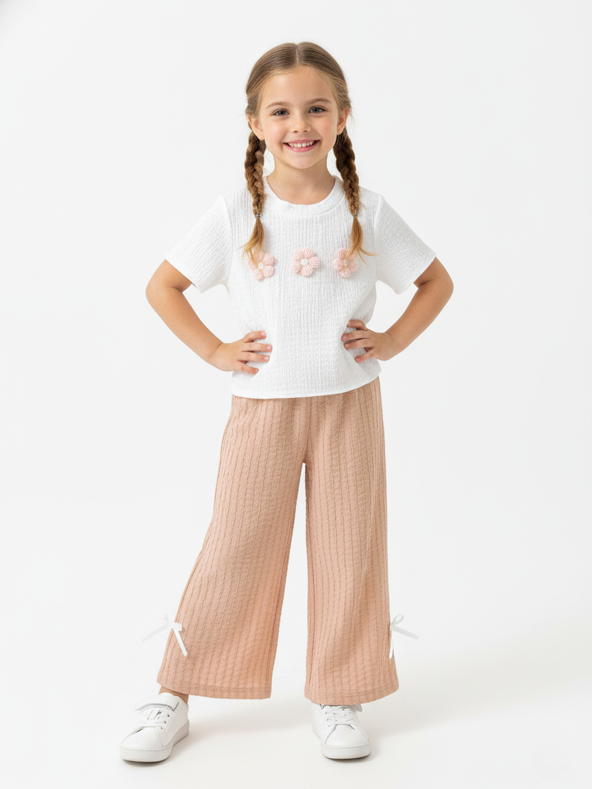 Discover this adorable girls’ two-piece outfit featuring a soft white top with 3D flower appliqués and cozy pink ribbed pants with side bows. Perfect for everyday wear, photoshoots, and special outings. Made from soft, breathable fabric to keep your little one stylish and comfortable all day long.