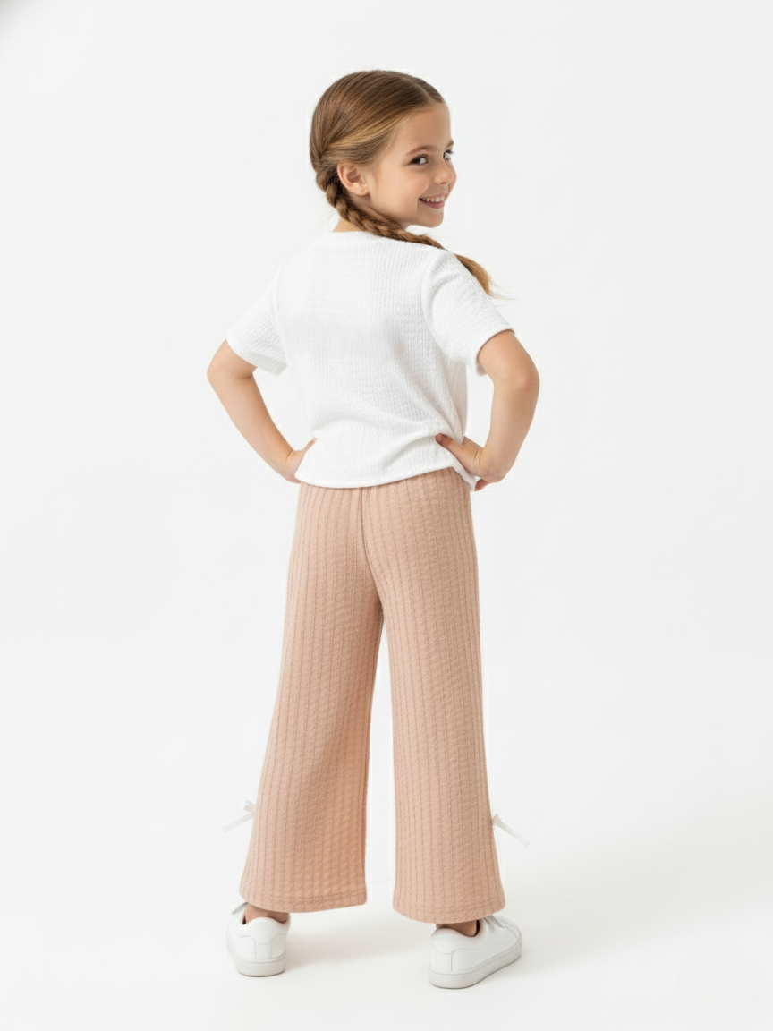• Comfort Fit: Pink wide-leg ribbed pants with bow details for style and ease.